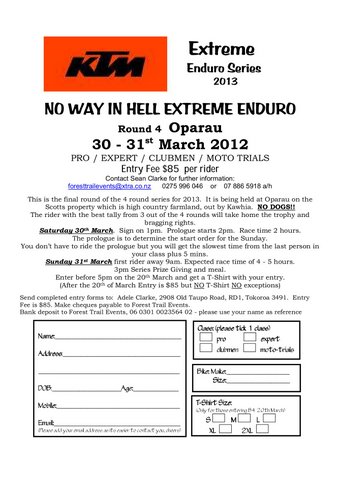 Please find attached an entry form for the No Way In Hell Extreme Enduro which is the final round of the KTM Extreme Enduro Series. This is being held on Saturday 30th and Sunday 31st of March 2013. Should be an awesome weekend to see who takes the glory of winning the series.