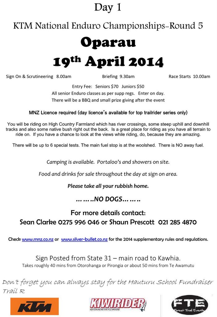 Sat 19th: Round 5 NZ National Enduro Champs (enter on day)