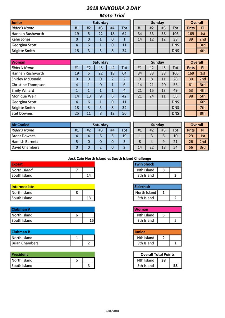 Kaikoura 3 Day Trial, RESULTS